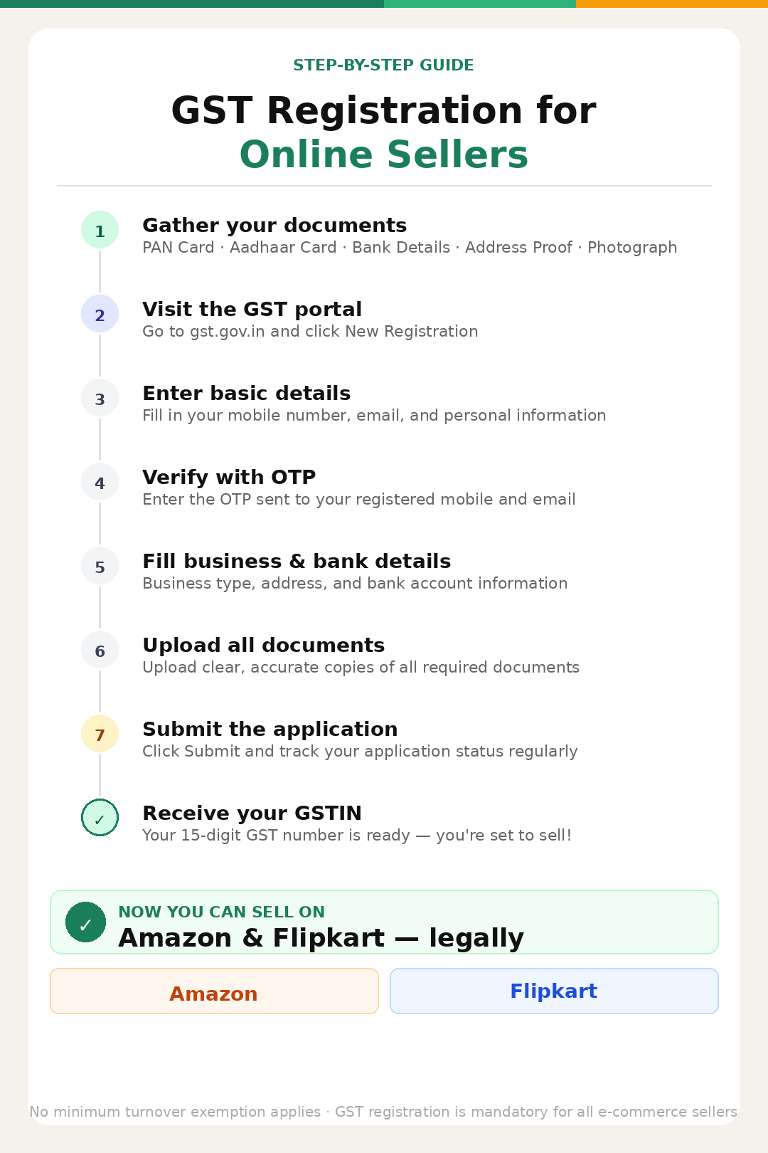If you are a seller on Amazon or Flipkart, you need to apply online using the GST Portal to get the registration done. It is mandatory to get the registration done.